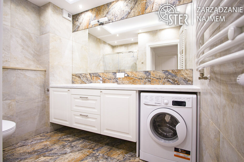 prysznicowa, duże lustro, pralka. W korytarzu szafy z lustrami.